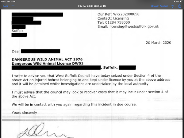 Correspondence between West Suffolk's licensing division and the RSPCA about rehoming a rescued, injured bobcat. West Suffolk advises the bobcat's owner that they have seized it under the Dangerous Wild Animals ActIf I have understood the correspondence and the Sun story correctly, while waiting to find out if the bobcat would be claimed, either the RSPCA or the vet seems to have called up their contact who they would ring whenever there was a lynx or bobcat that needed fostering.